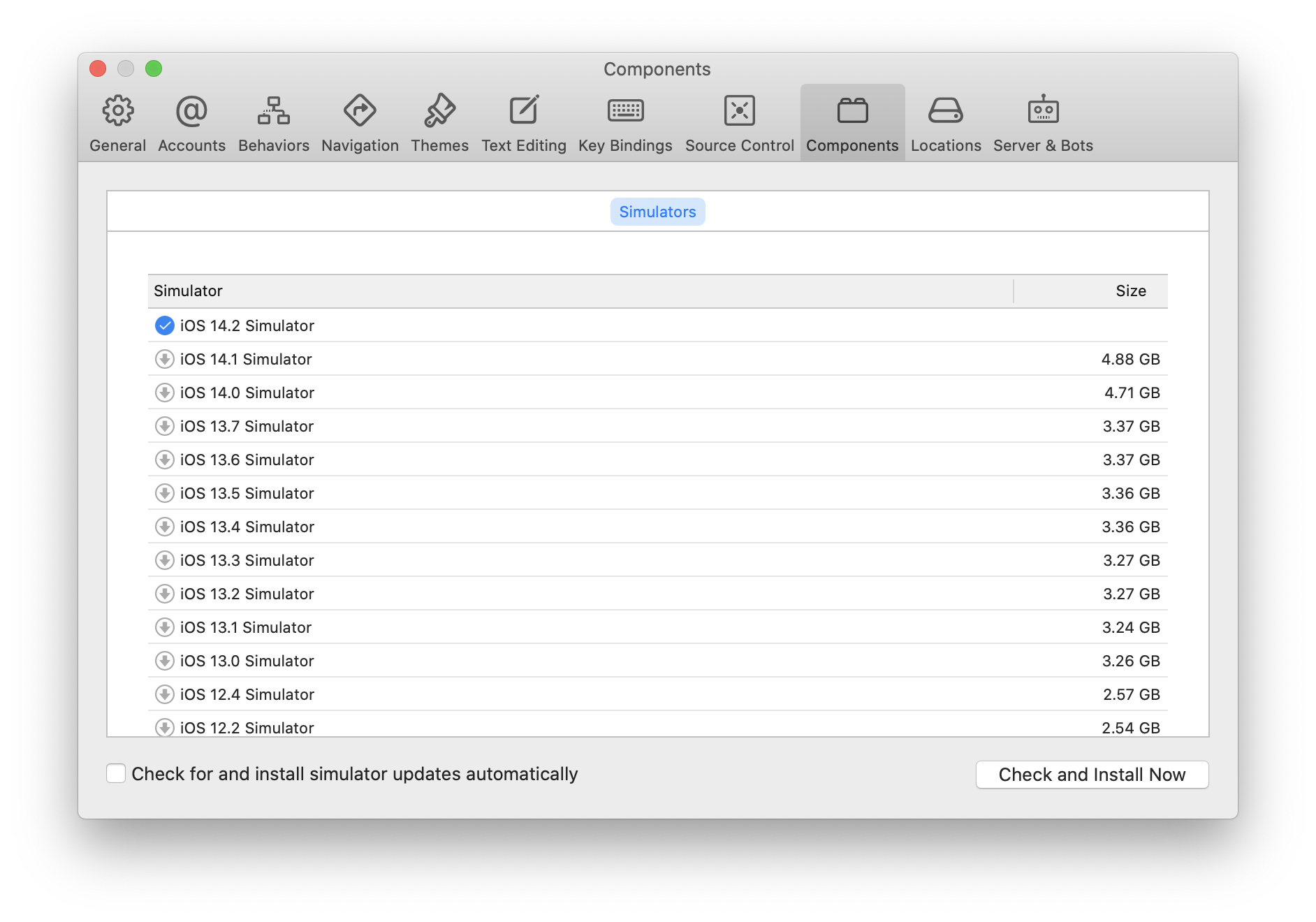 Xcode에서 iOS 시뮬레이터 설치하려면 상단 메뉴에서 Xcode -> Preferences... 를 열고 Components 탭을 선택한 뒤 사용하려는 iOS 버전이 있는 시뮬레이터를 선택하면 된다.