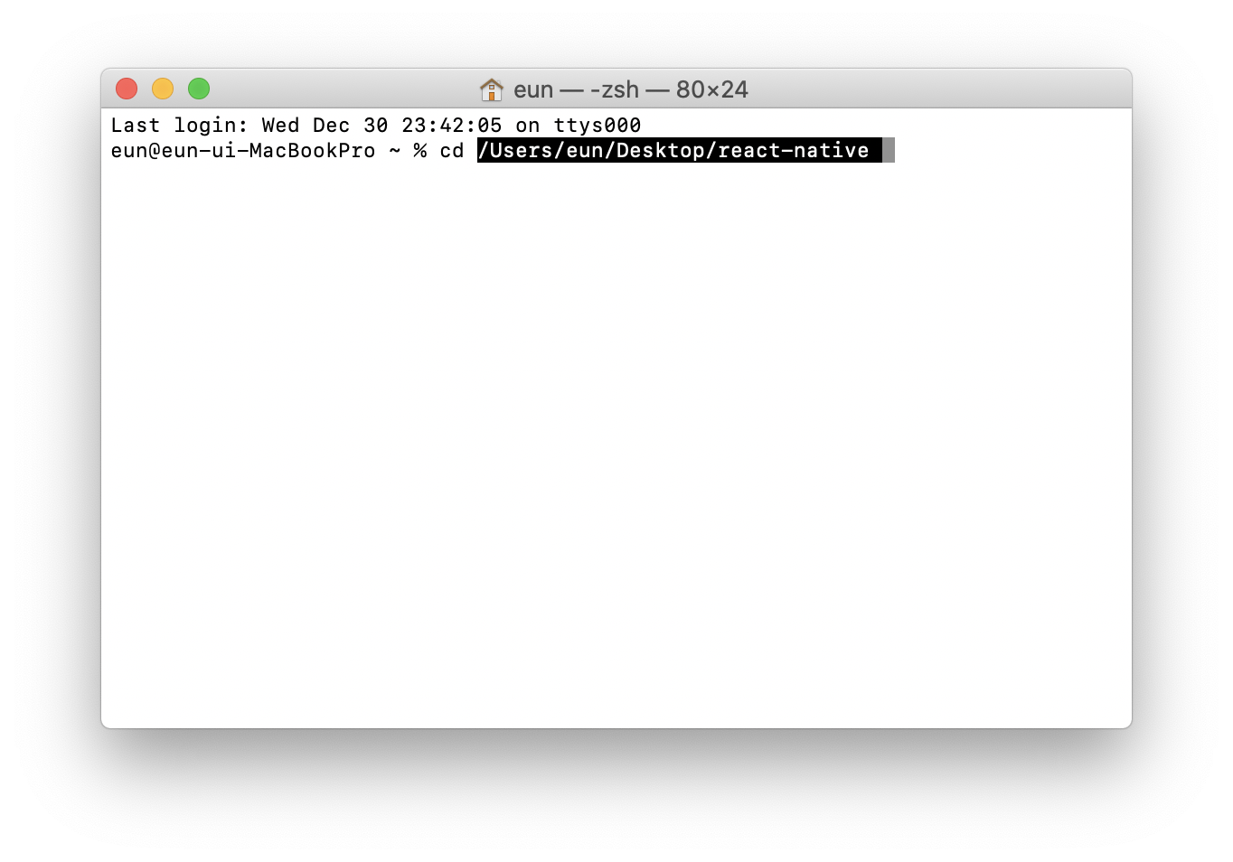 터미널 창을 열고 cd 라고 적어준 뒤 React Native 프로젝트를 생성할 폴더를 드로그 앤 드랍 해준 뒤 엔터를 누르면 해당 폴더로 이동한다.