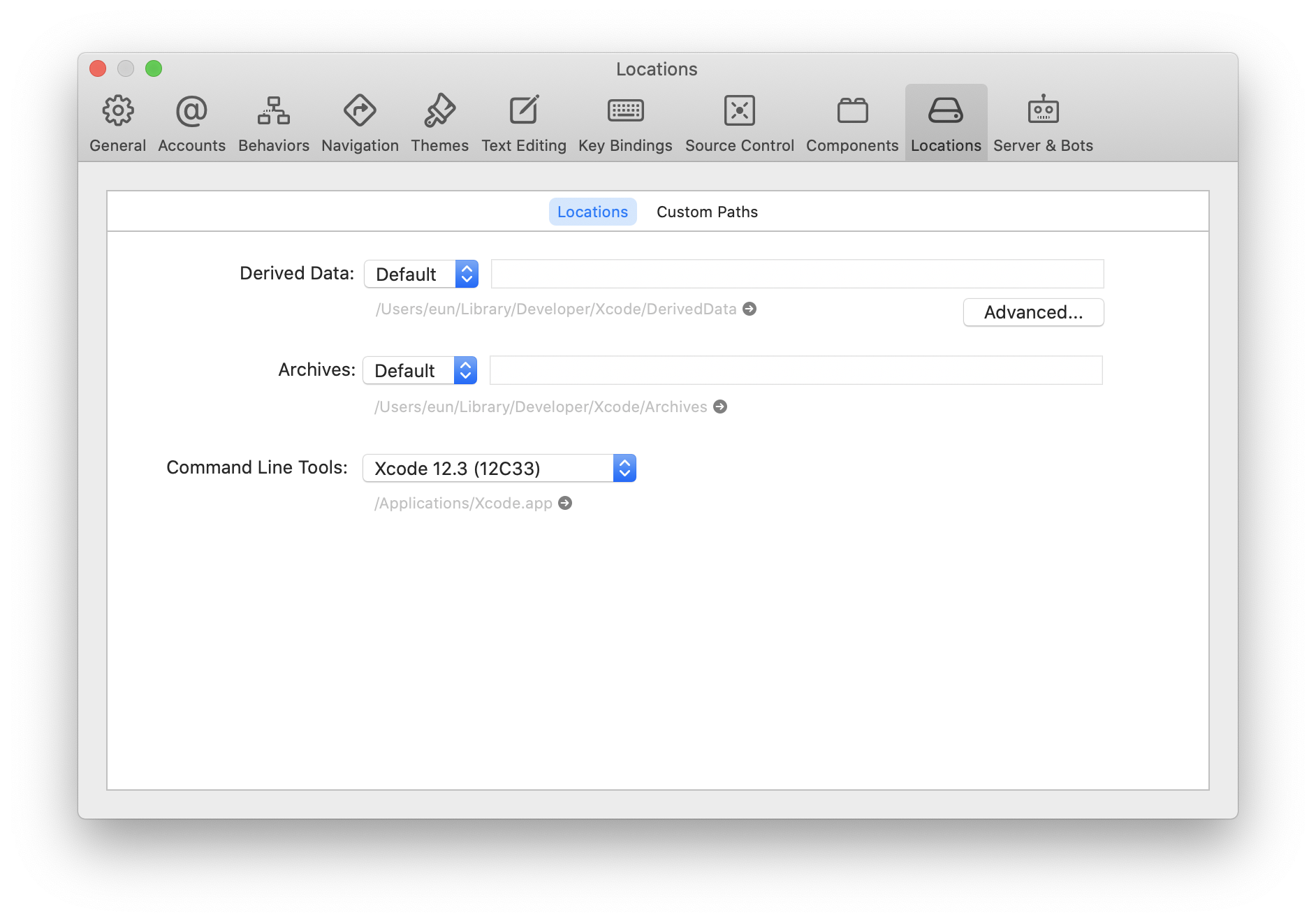 Xcode 를 설치 한 다음 Xcode를 실행하고 상단 메뉴에서 Xcode -> Preferences... 를 열고 Locations 탭 에서 Command Line Tools가 잘 설정되어 있는지 확인한다.