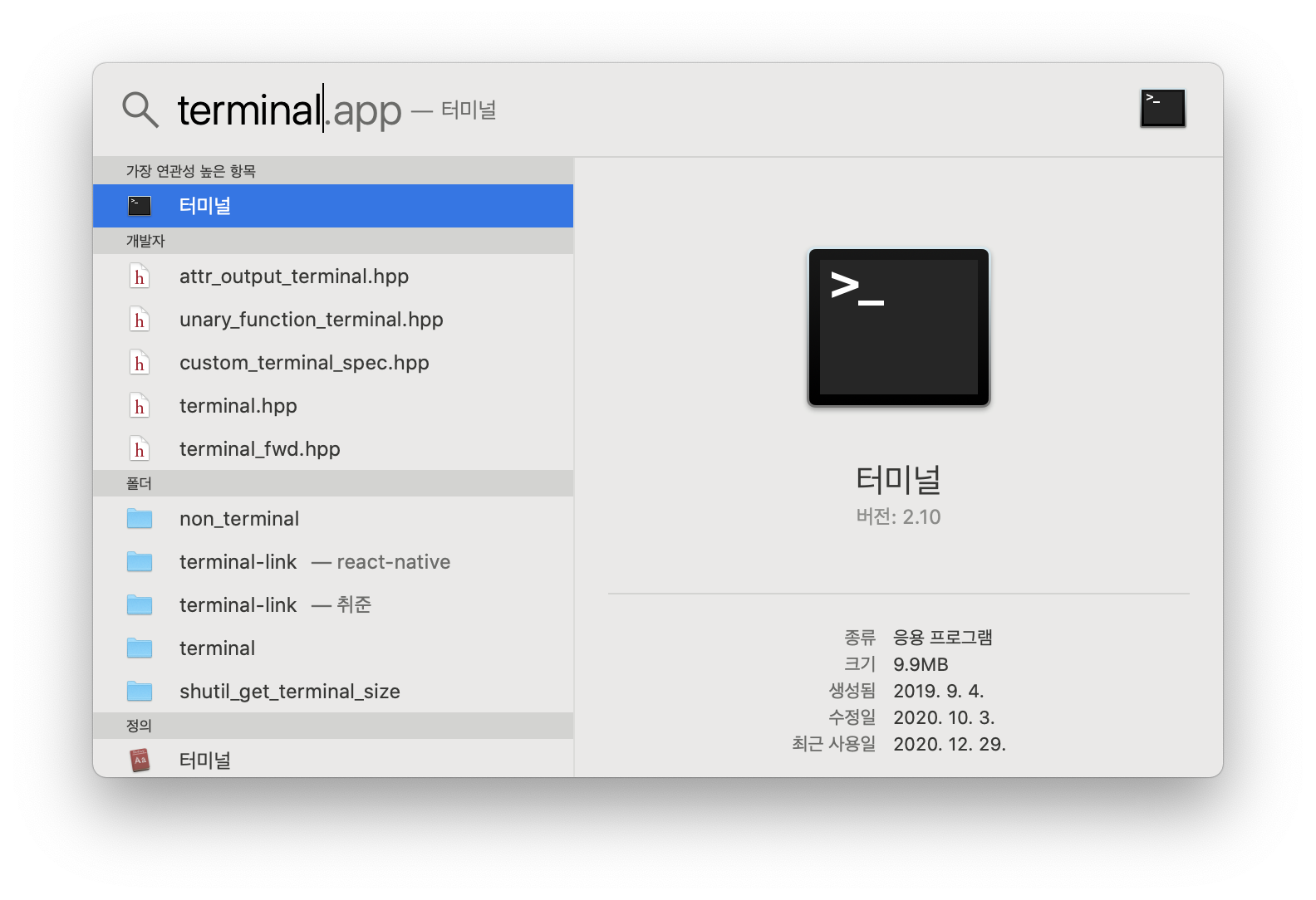 command + space 를 눌러 Spotlight 검색창을 실행시켜준 뒤 terminal 또는 터미널 을 검색해서 터미널을 실행시켜 준다.