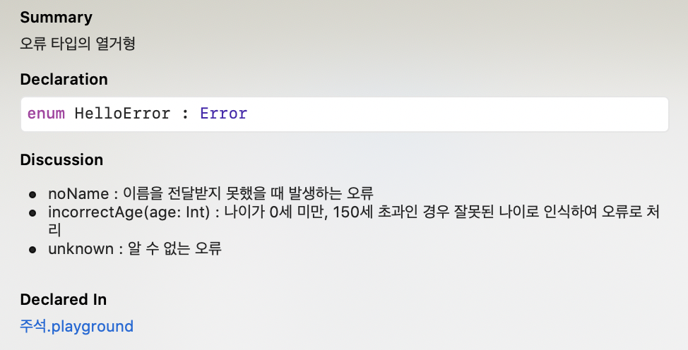 - Throws : 오류가 발생하면 HelloError의 한 케이스를 throw