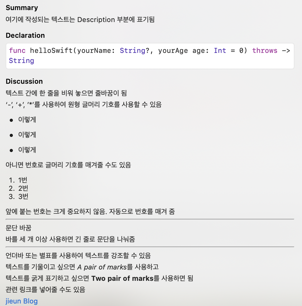 마크업 문법에 맞춰 메서드나 변수, 클래스 등에 주석을 작성하면 퀵헬프로 다른 프로그래머가 해당 내용을 확인할 수 있음