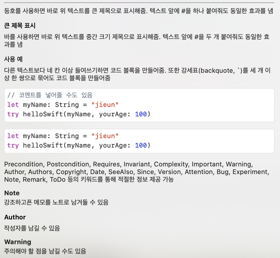 - 자동으로 문서화 주석 코드 조각을 생성하려면 문서로 만들려는 요소(상수, 변수, 함수 등)에 커서를 위치한 후 Xcode 메뉴의 [Editor] -> [Structure] -> [Add Documentations] (단축키